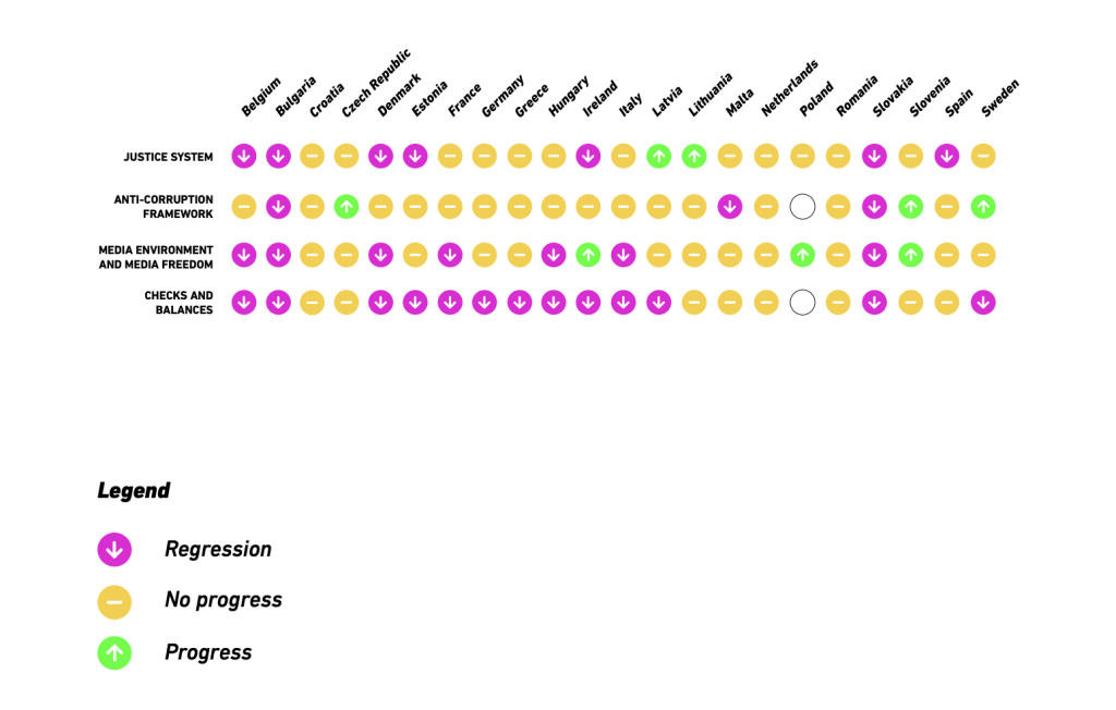 Чехия, Естония, Гърция, Ирландия, Литва, Нидерландия, Румъния и Испания бяха класифицирани като „стагниращи“, определени като държави, в които условията на върховенството на закона нито се подобряват, нито се влошават, според доклада от 800 страници.